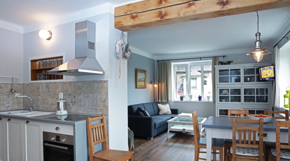 Přízemní apartmán s jihovýchodní orientací s možností bezbariérového přístupu. Součástí apartmánu je ložnice s manželskou postelí a jedním samostatným lůžkem, obývací pokoj s rozkládacím gaučem pro dvě osoby propojený s kuchyňským koutem s jídelním stolem, lednicí, pečící i mikrovlnnou troubou. O vaši hygienu se postará samostatná koupelna se sprchovým koutem a samostatná toaleta. Zejména sportovci ocení dostatek odkládacích ploch a háčků nejen v koupelně. |